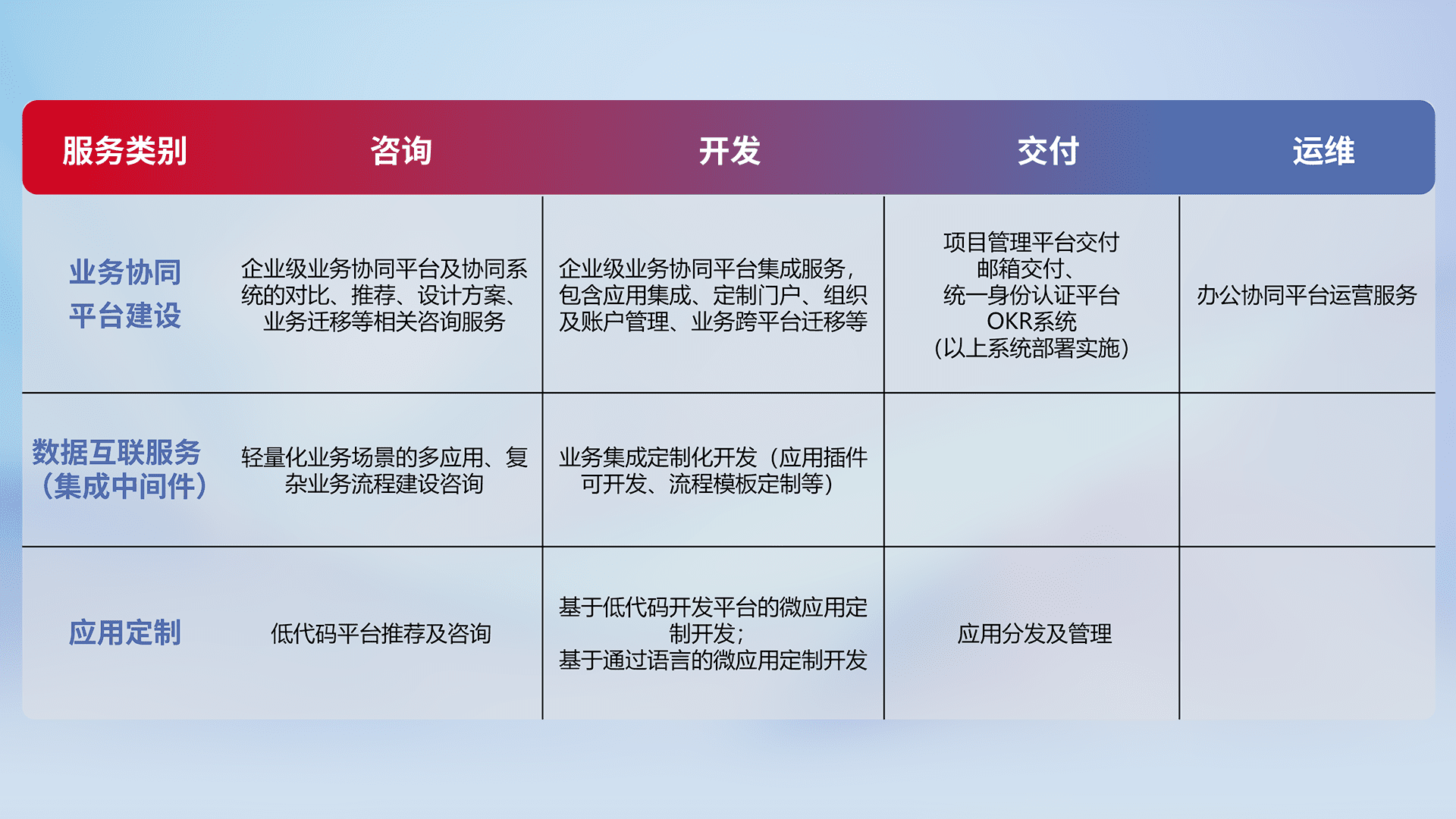针对钉钉、、企微、、、、IDaas等平台级产品提供产品的规划、、方案、、、交付、、定制化开发等服务,,,实现如统一协同办公、、、、智能客户服务、、混合会议管理、、、、智能数据查询、、等业务场景,,,实现数字化转型。。