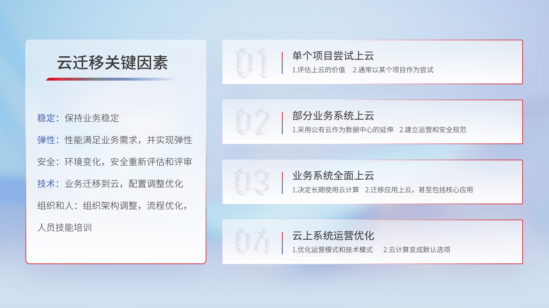 结合实际业务,,从规划设计、、、、云平台选型、、云原生改造、、数据迁移、、、、集成交付,,迁移全过程为客户识别最佳上云路径,,做好风险识别管理,,设计网络架构、、、、身份权限、、、安全审计合规、、、操作审计、、、日志审计、、、、监控告警策略、、多站点容灾设计等,,,,对云上基础设施进行整体规划,,提升IT治理水平,,,以满足弹性、、高可用、、、、高性能的需求。。。