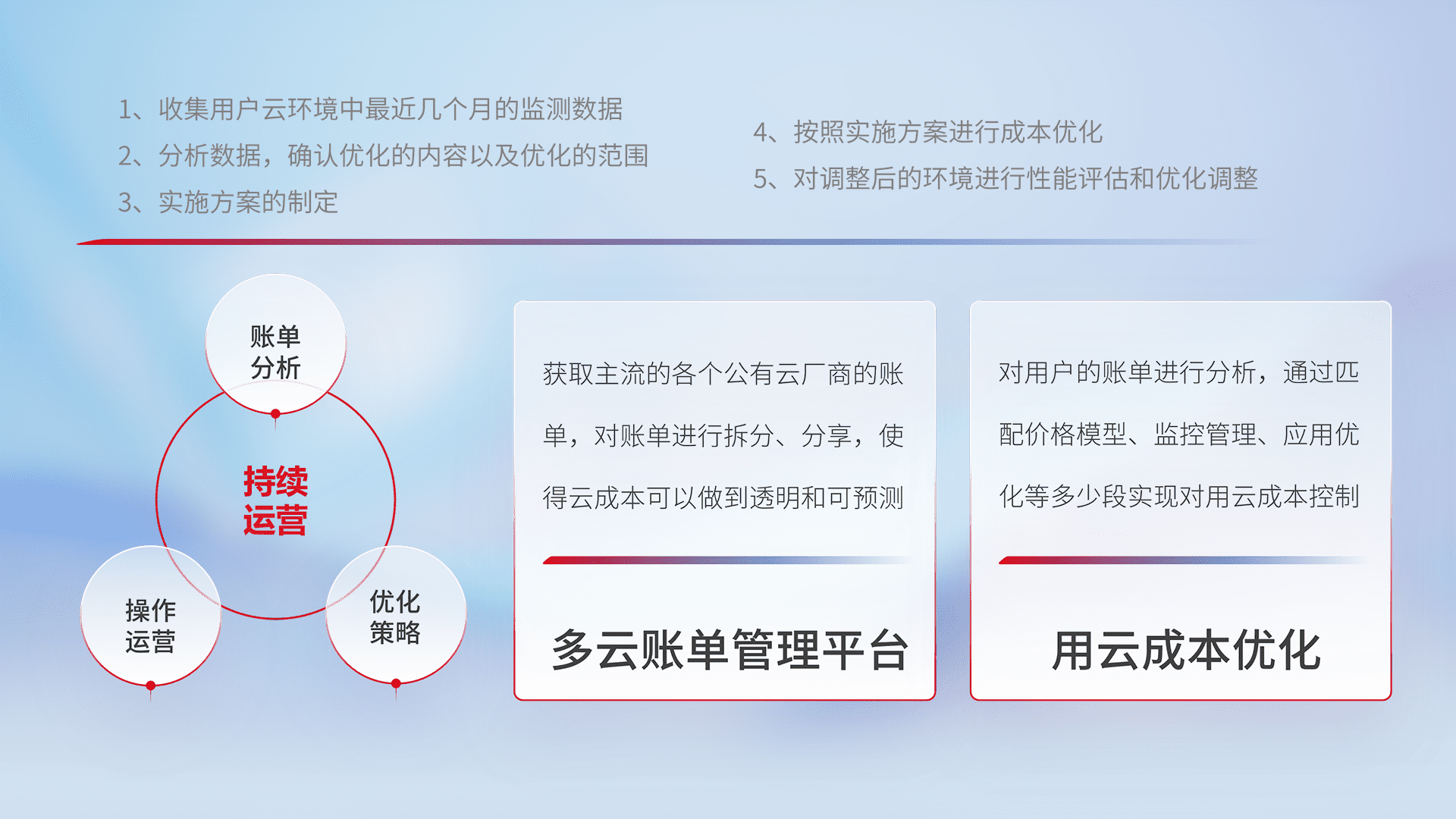 通过多云纳管,,,,以统一的资源数据模型把客户的云资源进行抽象和封装,,,进而实现对多云资源的统一操作,,,,保障云资源管理的可靠性、、稳定性与可用性。。。量身定制化运维内容,,,配置、、、、开发运维、、补丁管理、、、备份、、监控、、认证和访问管理、、审计和日常巡检等,,保障在用云过程中的可靠度,,稳定度以及高可用率。。。