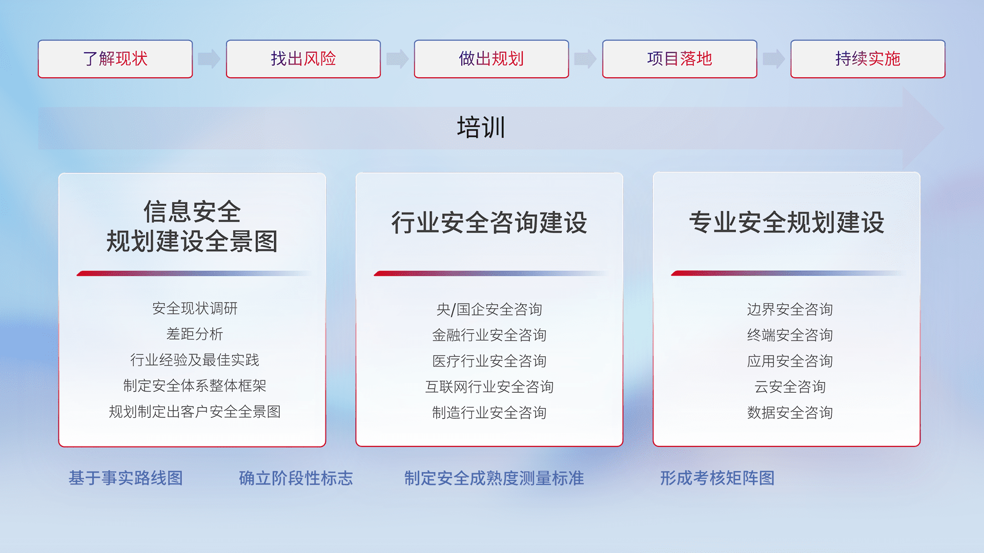 针对客户行业特性,,以专业的安全服务+多厂商联合解决方案提供专属的一站式安全管理服务,,帮助客户全面感知网络空间威胁,,,,基于识别、、、检测、、分析、、、防护、、监测、、、响应的服务理论模型,,,从方案咨询、、集成交付、、、、评估验证、、、、优化加固、、运维运营,,,致力于为客户提供完整的闭环管理式安全服务。。以实战经验为客户打造高抵御风险的安全体系,,帮助客户发现威胁、、对抗威胁、、、处置威胁,,,,不断积累安全对抗能力,,持续保障数字化安全。。